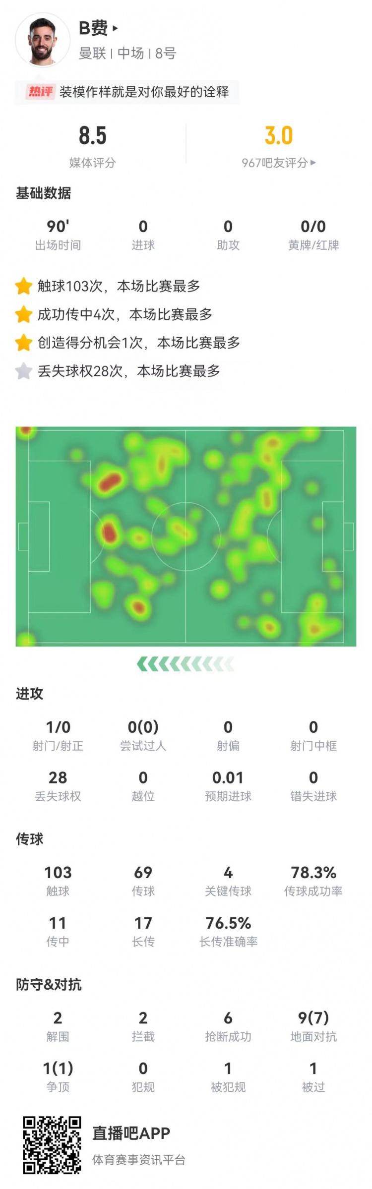 2月17日訊 曼聯(lián)在本輪英超0-1不敵熱刺,B費(fèi)本場數(shù)據(jù)如下: